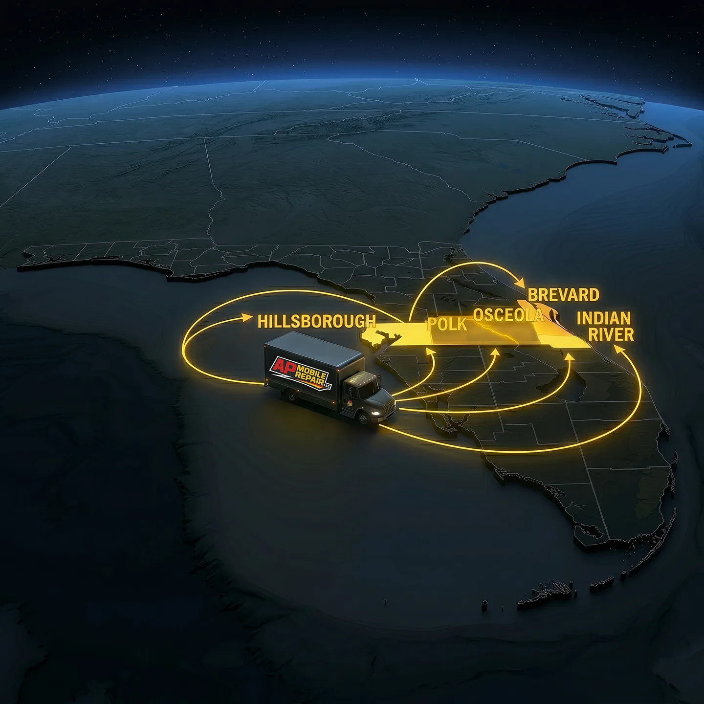 When your truck or equipment goes down, getting it to a shop isn’t always possible—that’s where AP Mobile Repair comes in. We provide mobile diesel repair services across Brevard County, Indian River County, Polk County, Hillsborough County, and surrounding Central Florida areas, bringing professional diagnostics and repairs directly to your location.